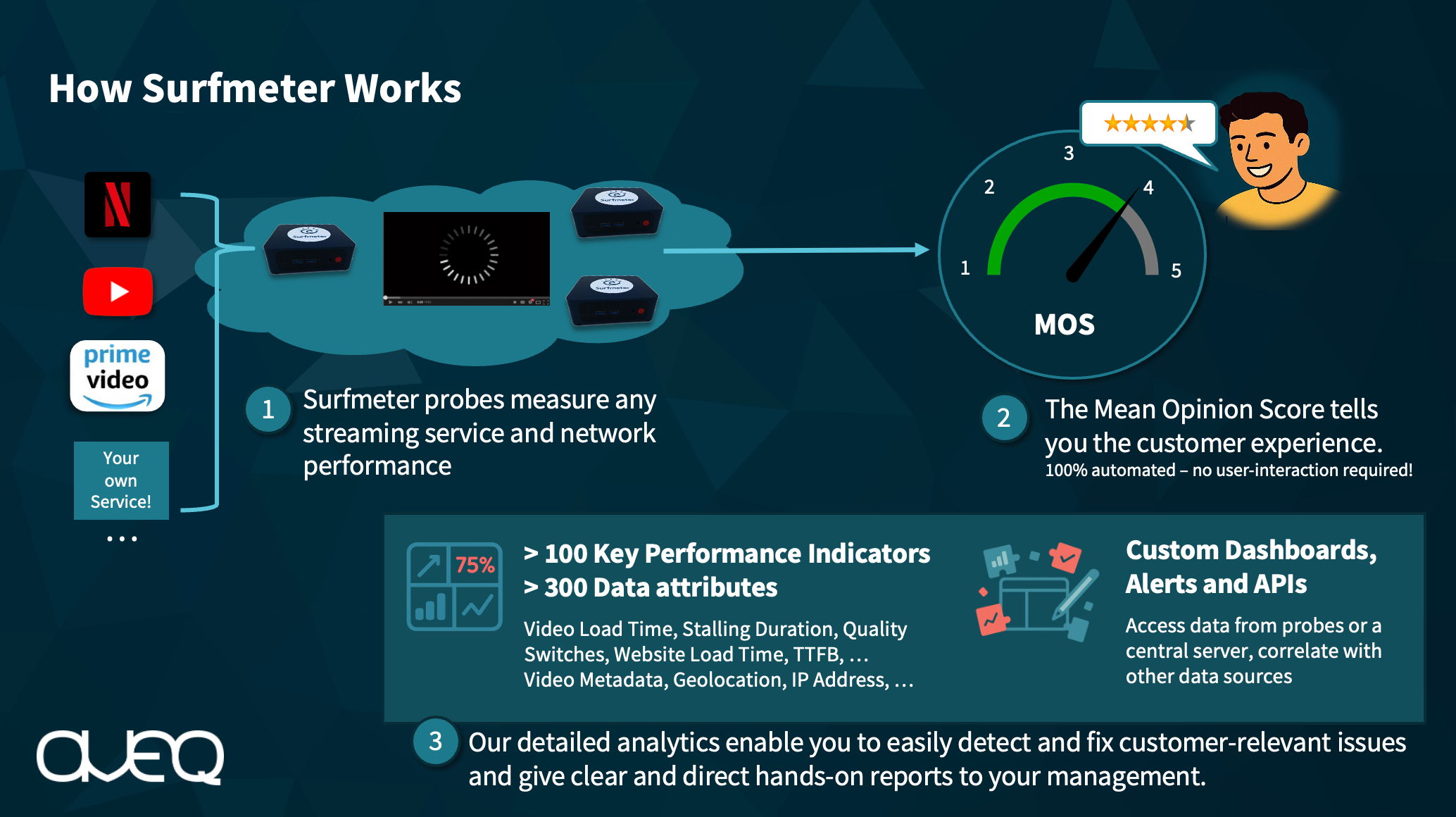 From there, our service continuously and passively (Player SDK) or actively (Quality SDK) measures the real-world performance of: